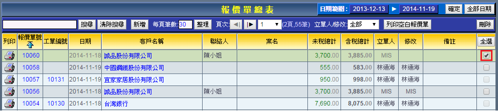 1. 若您要刪除報價單,在報價單總表勾選您要刪除的報價單後,再點選「刪除」即可。請注意:僅可刪除未有