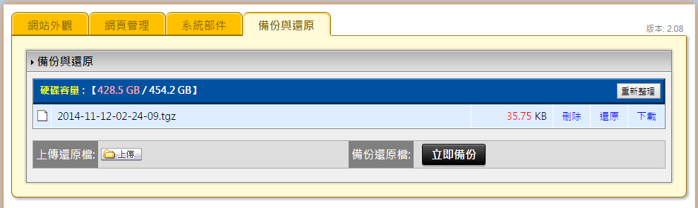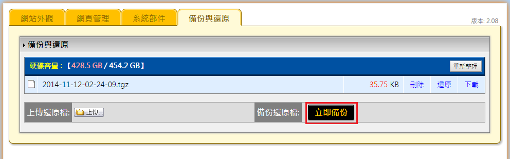 | 1. 要備份網站資料,點選「立即備份」便會將全網站的資料備份為tgz的通用壓縮檔格式,其備份完成時間會依整個網站內容的大小而 定。 |