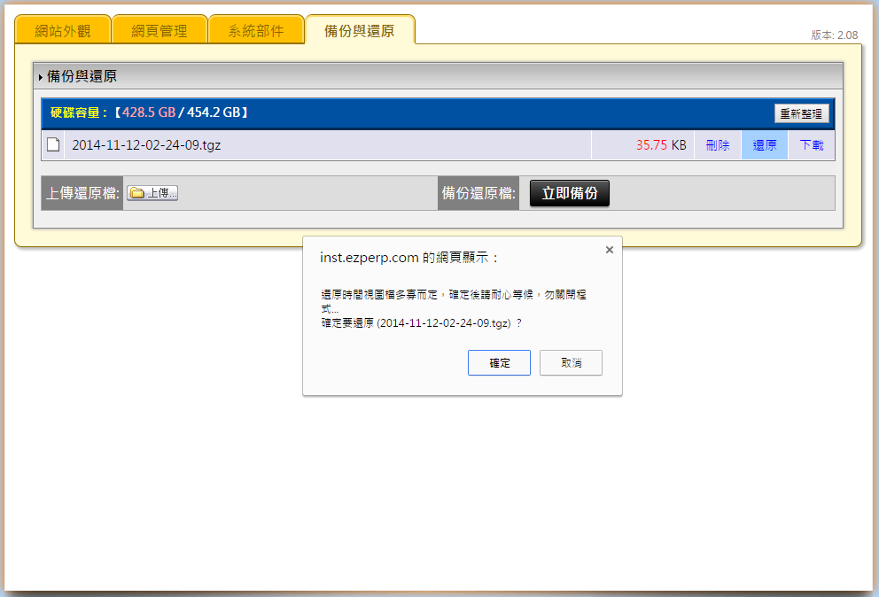 | 1. 如果遭遇網站資料毀損需要恢復,點選「還原」便會彈出是否確定還原的詢問視窗,按下「確定」便會進行還原動作,還原完成時 間會依還原檔大小而定。請注意:如果還原壓縮檔的資料版本為非當前網站的版本,將會還原失敗。 |